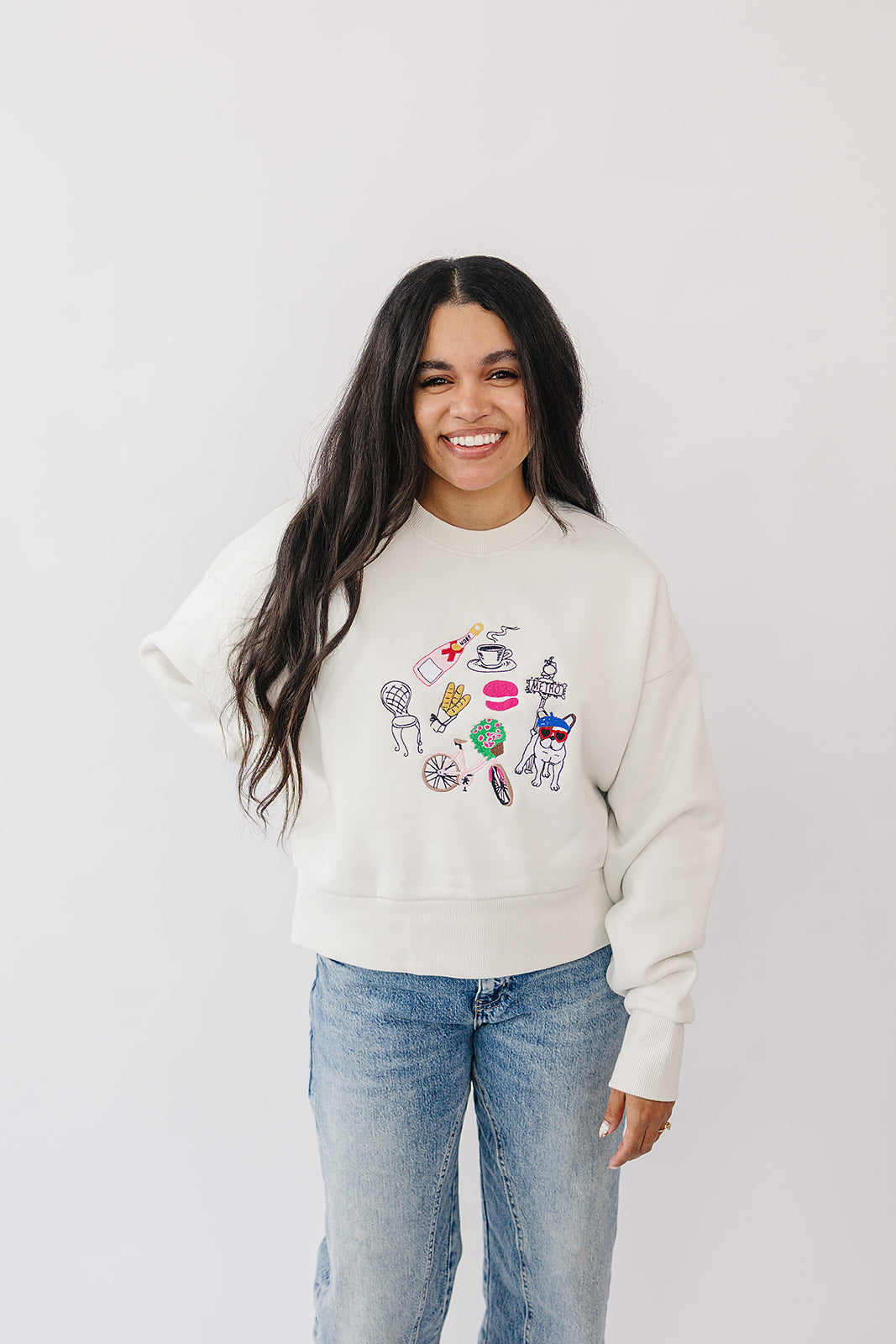 A little embroidery daydream: pink macarons, fresh baguettes, cafe au lait, and a champagne bottle on standby. This crew wears like a weekend in the 6th — sun-warmed café chairs, slow mornings, and nothing on the agenda but joy.