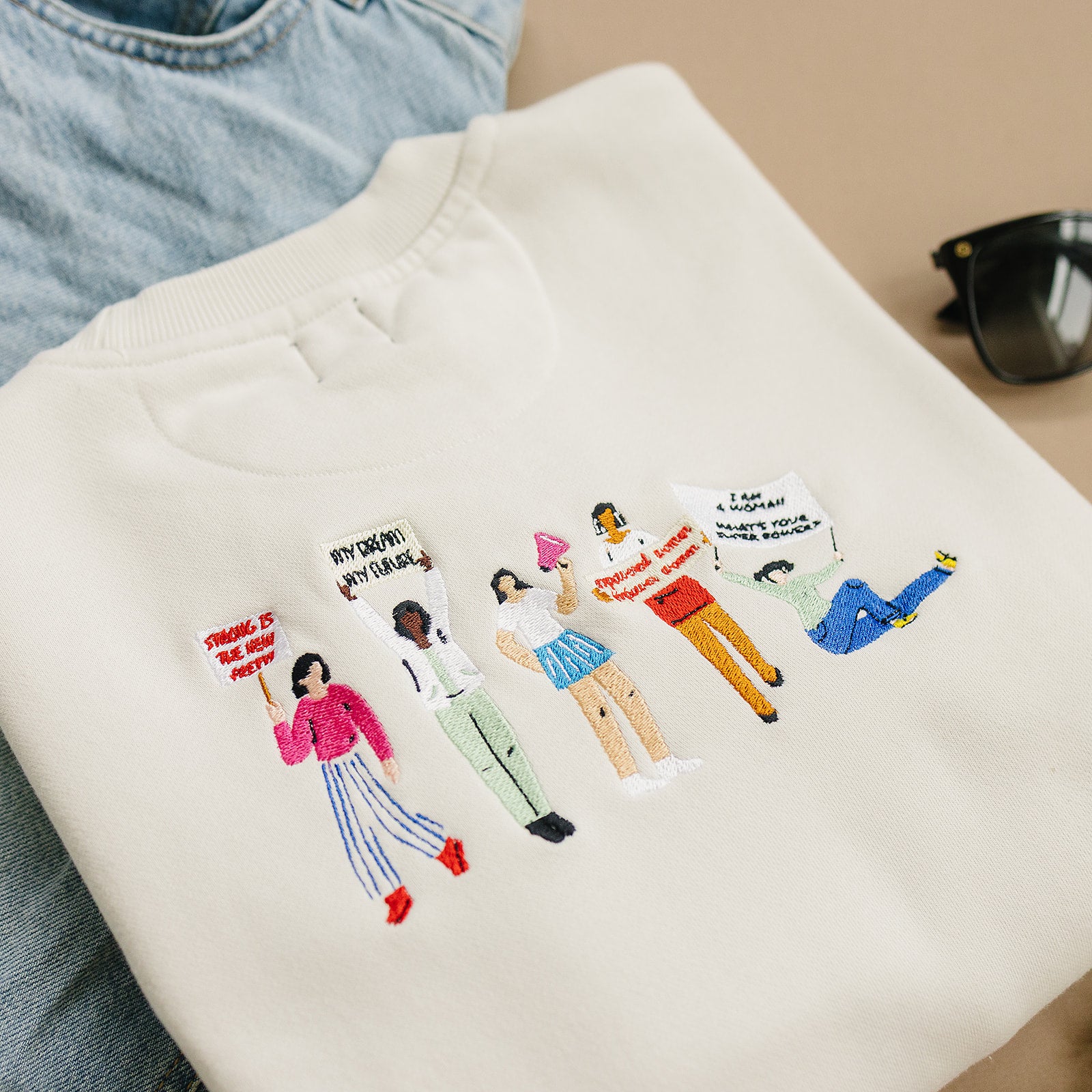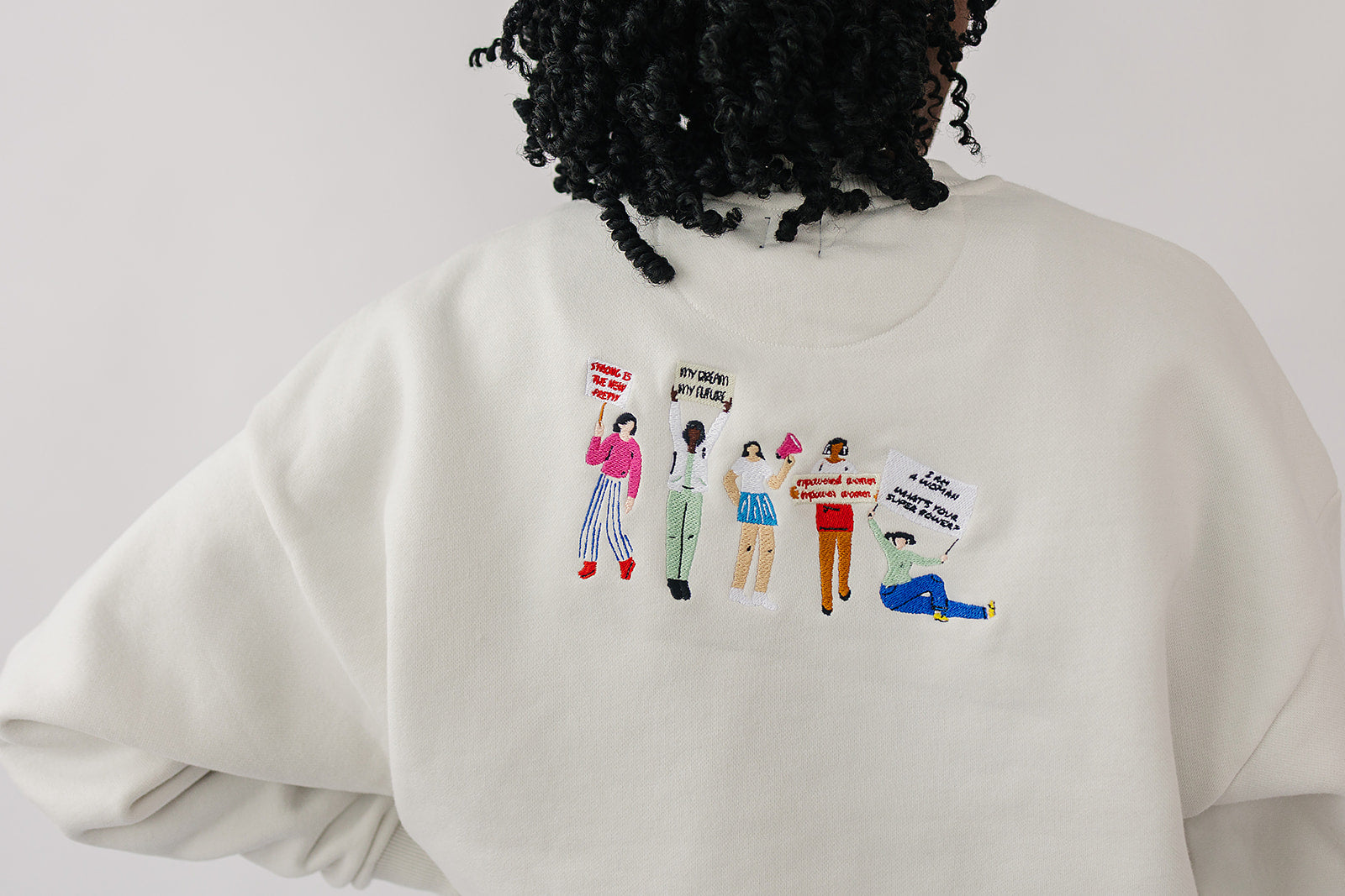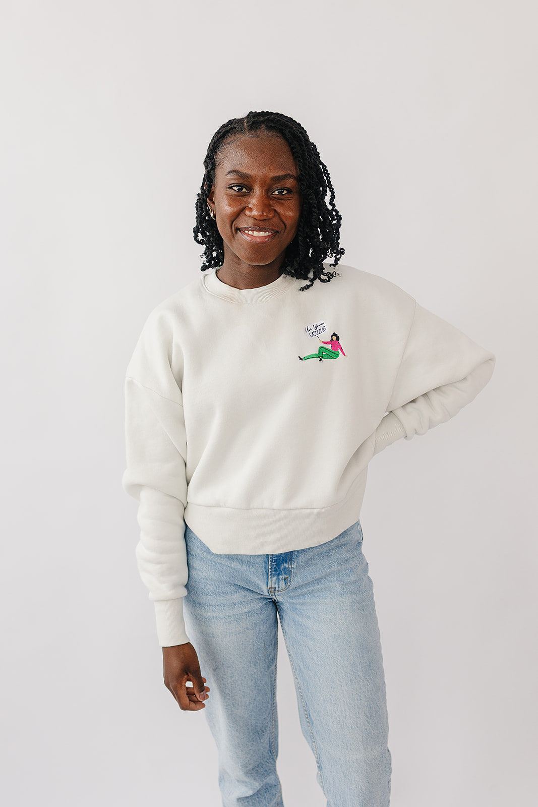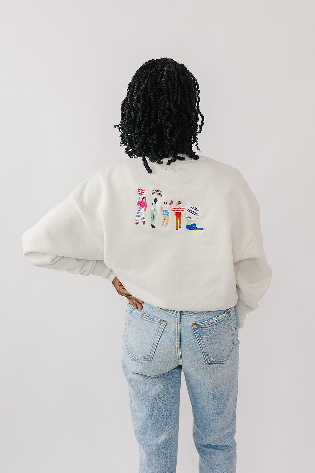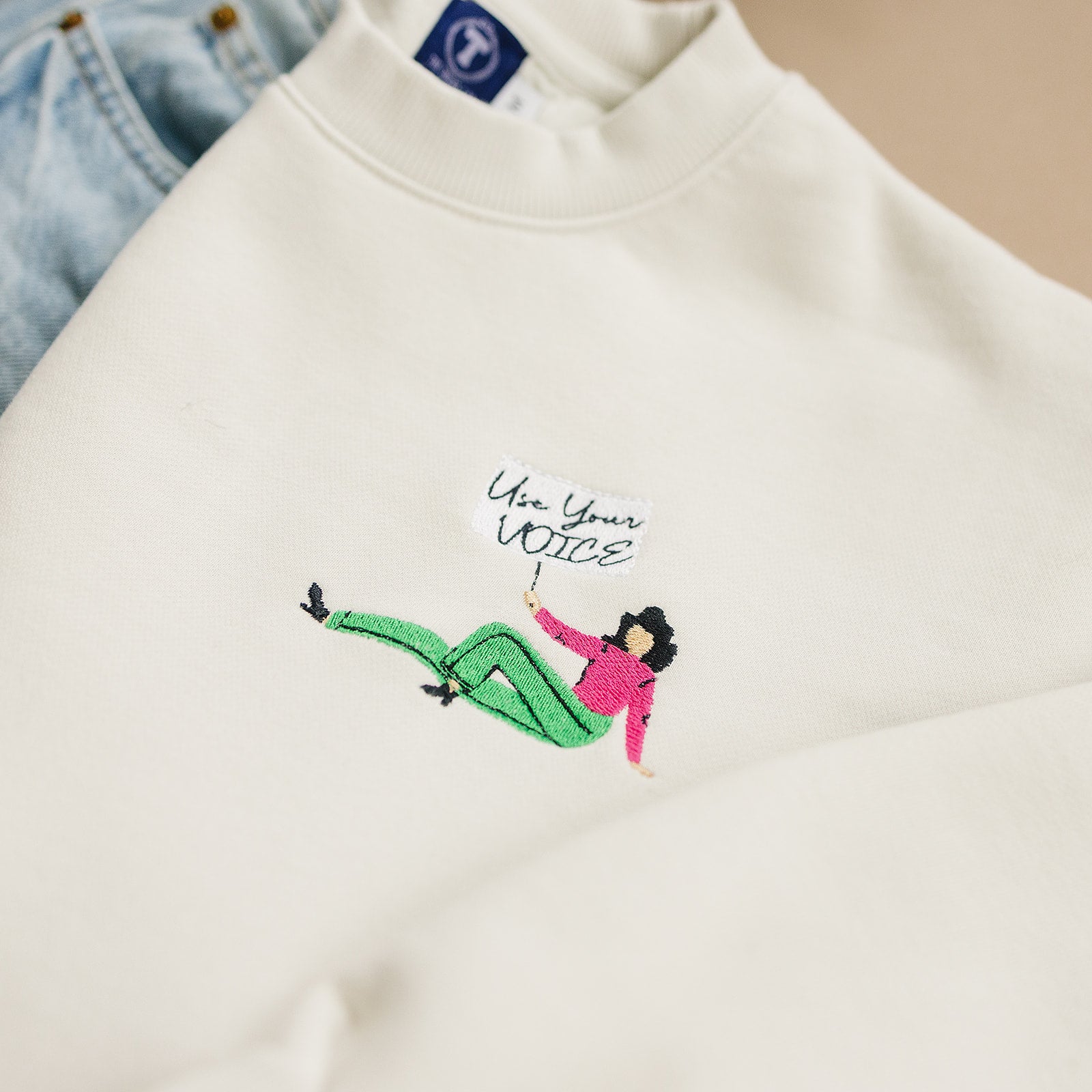 This crew is a celebration of the ways we show up—bold, quiet, colorful, calm, and everything in between. On the chest, a reminder that your voice matters. On the back, a lineup of embroidered women, each showing up in her own way.